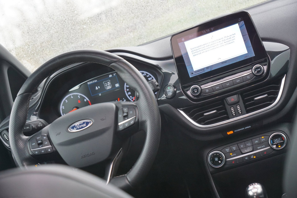 Go Further, is de filosofie van Ford. Een vooruitstrevend motto dat ook bij dit model tot z'n recht komt. Een driecilinder motor en een handgeschakelde zesversnellingsbak zorgen voor de uitstekende prestaties van deze auto. Een weldaad voor u en uw bijrijder: deze Ford Fiesta heeft verwarmbare voorstoelen. Stevig ondersteund door de sportstoelen blijft u bij elke beweging op uw plek. Volop licht en ruimtelijk gevoel geeft het elektrische bediende glazen panoramadak. Nooit meer koude handen of koude vingers in de auto. Stuurverwarming zorgt ervoor dat het stuur behaaglijk warm aanvoelt. Ook 18 inch lichtmetalen velgen, LED koplampen, sportonderstel, halflederen bekleding, extra getint glas en in delen neerklapbare achterbank zijn aan boord.